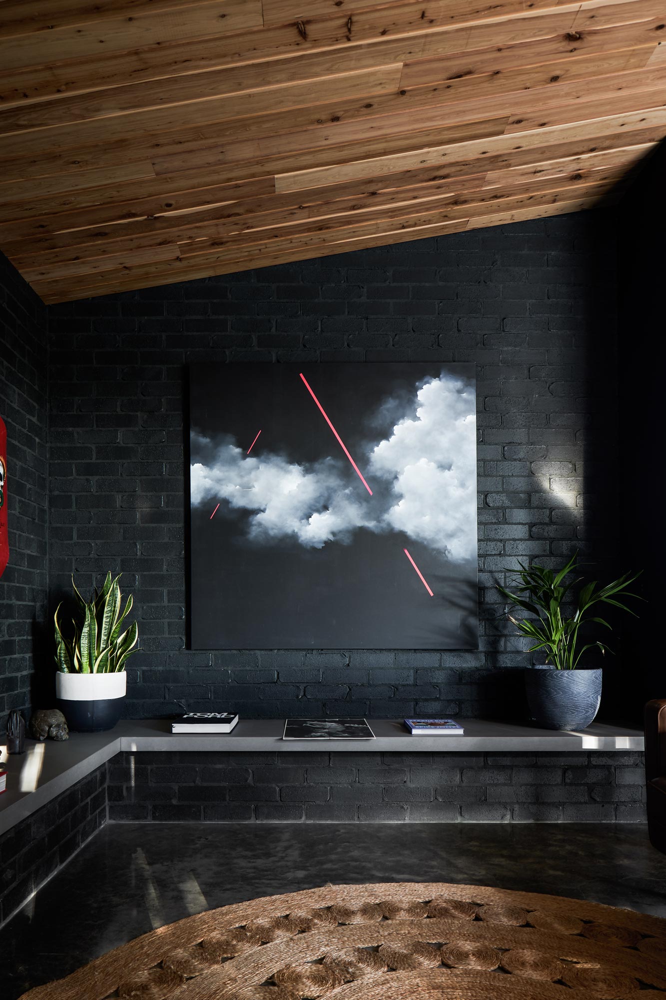 The mysterious exterior form gives rise to the drama of a dark and moody interior. Burnished concrete floors and cypress ceilings sandwich a material palette that explores every imaginable shade of charcoal. Black brick walls bring a textural finish that sits in contrast to walls rendered matt black. Black powder-coated aluminium and steel complete door and window frames as well as balustrades and handrails. Monochromatic accents come in the form of stainless steel in the kitchen and concrete bench tops which overlay black with cool grey.